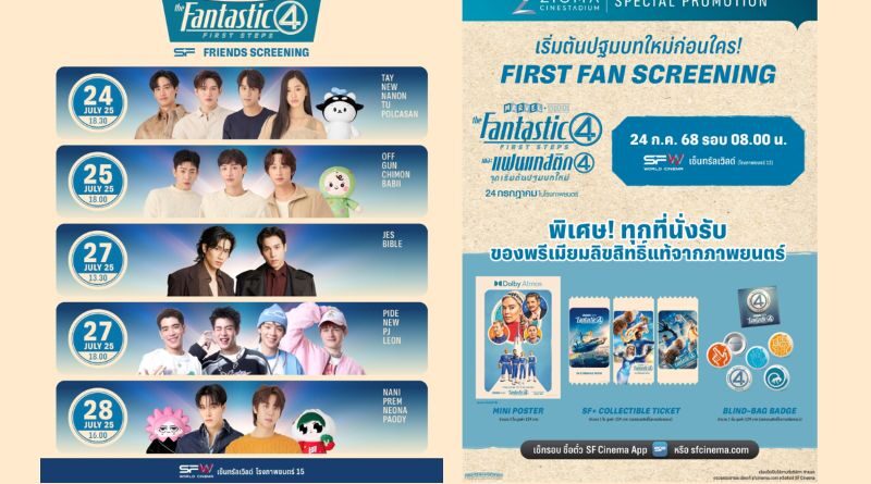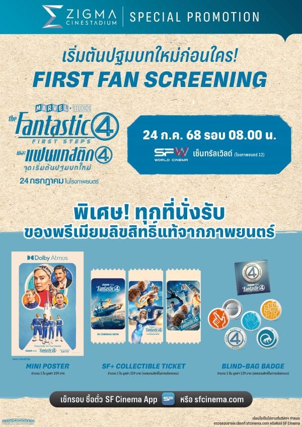 · รอบพิเศษ !! First Fan Screening ภาพยนตร์ “The Fantastic Four: First Steps (เดอะ แฟนแทสติก โฟร์: จุดเริ่มต้นปฐมบทใหม่)” ซื้อบัตรชมภาพยนตร์วันที่ 24 กรกฎาคม 2568 รอบเวลา 8.00 น. กับระบบเสียง Dolby Atmos และที่นั่งสบายที่สุด ที่โรงภาพยนตร์ ZIGMA CINESTADIUM สาขา เอส เอฟ เวิลด์ ซีเนม่า ศูนย์การค้าเซ็นทรัลเวิลด์ ในราคาเริ่มต้น 320 บาท ทุกที่นั่งรับของที่ระลึกลิขสิทธิ์แท้จากภาพยนตร์ อาทิ Blind Bag Badge 1 ชิ้น, SF Collectible Ticket 1 ใบ และ มินิโปสเตอร์ ZIGMA CINESTADIUM 1 ใบ