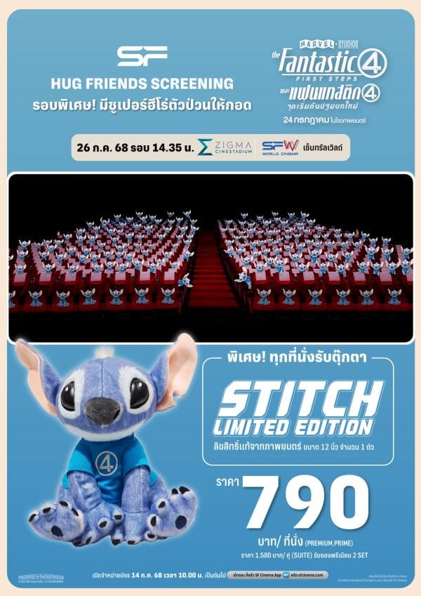 · รอบพิเศษ !! SF Hug Friends Screening ภาพยนตร์ “The Fantastic Four: First Steps (เดอะ แฟนแทสติก โฟร์: จุดเริ่มต้นปฐมบทใหม่)” ซื้อบัตรชมภาพยนตร์วันที่ 26 กรกฎาคม 2568 รอบเวลา 14.35 น. ที่โรงภาพยนตร์ ZIGMA CINESTADIUM สาขา เอส เอฟ เวิลด์ ซีเนม่า ศูนย์การค้าเซ็นทรัลเวิลด์ ในราคาเริ่มต้น 790 บาท ทุกที่นั่งรับตุ๊กตา Stitch Limited Edition ขนาด 12 นิ้ว ลิขสิทธิ์แท้จากภาพยนตร์