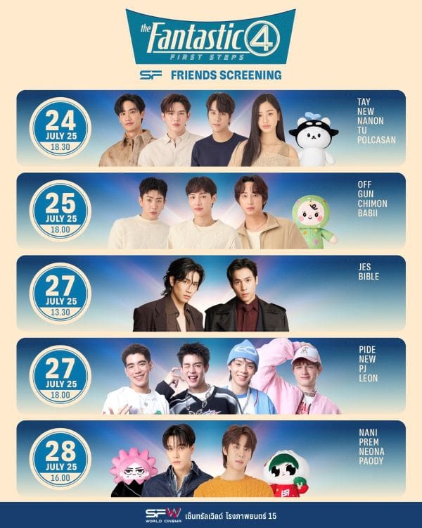 · ดูหนังพร้อมร่วมกิจกรรมกับศิลปินแบบจัดเต็มกับรอบ SF Friends Screening ภาพยนตร์ “The Fantastic Four: First Steps (เดอะ แฟนแทสติก โฟร์: จุดเริ่มต้นปฐมบทใหม่)” ที่โรงภาพยนตร์ที่ 15 เอส เอฟ เวิลด์ ซีเนม่า ศูนย์การค้าเซ็นทรัลเวิลด์ ราคาที่นั่งละ 800 บาท พร้อมรับฟรีป๊อปคอร์น ไซส์ M 1 กล่อง เปิดจำหน่ายบัตรวันที่ 21 กรกฎาคม 2568 เวลา 12.00 น. เป็นต้นไป ผ่านเคาน์เตอร์เซอร์วิสในร้าน 7-Eleven และเวลา 14.00 น. ทางเว็บไซต์ ALL TICKET