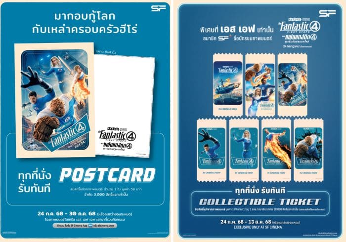 · เมื่อซื้อบัตรชมภาพยนตร์ “The Fantastic Four: First Steps (เดอะ แฟนแทสติก โฟร์: จุดเริ่มต้นปฐมบทใหม่)” รอบปกติทุกที่นั่ง (ทุกช่องทางการจำหน่าย) รับโปสการ์ดลิขสิทธิ์แท้จากภาพยนตร์ จำนวน 1 ใบ ตั้งแต่ที่ 24 กรกฎาคม 2568 เป็นต้นไปจนตลอดโปรแกรมฉาย หรือจนกว่าสินค้าจะหมด