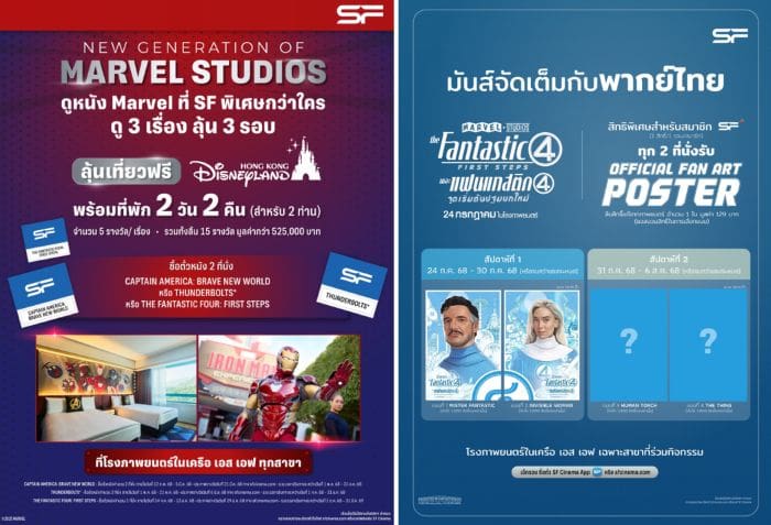 · สมาชิก SF+ ที่ซื้อบัตรชมภาพยนตร์ “The Fantastic Four: First Steps (เดอะ แฟนแทสติก โฟร์: จุดเริ่มต้นปฐมบทใหม่)” โรงภาพยนตร์ปกติ ระบบปกติ พากย์ไทยทุก 2 ที่นั่ง (ทุกช่องทางการจำหน่าย) รับออฟฟิเชียลแฟนอาร์ตโปสเตอร์ลิขสิทธิ์แท้จากภาพยนตร์ จำนวน 1 ใบ ( 1 ใบ / 1 รอบ / 1 สมาชิก ) มี 4 แบบ ให้สะสม แบ่งแจกรายสัปดาห์ ตั้งแต่ที่ 24 กรกฎาคม 2568 เป็นต้นไปจนตลอดโปรแกรมฉาย หรือจนกว่าสินค้าจะหมด