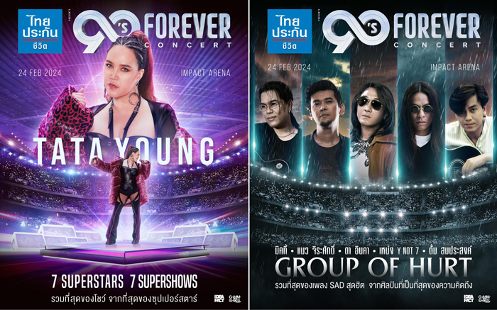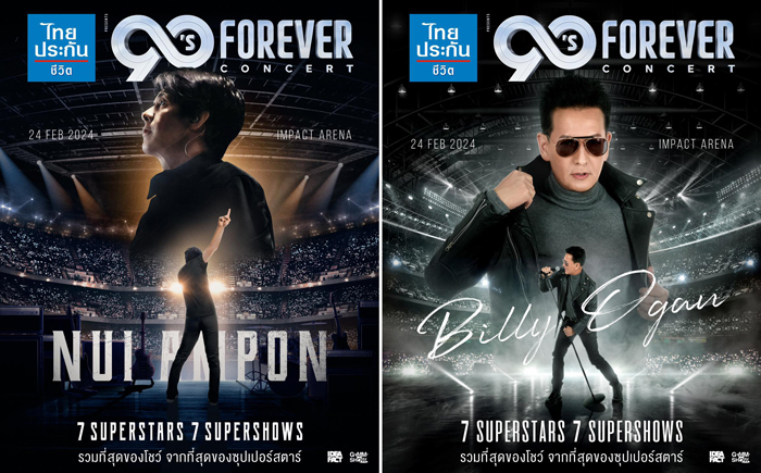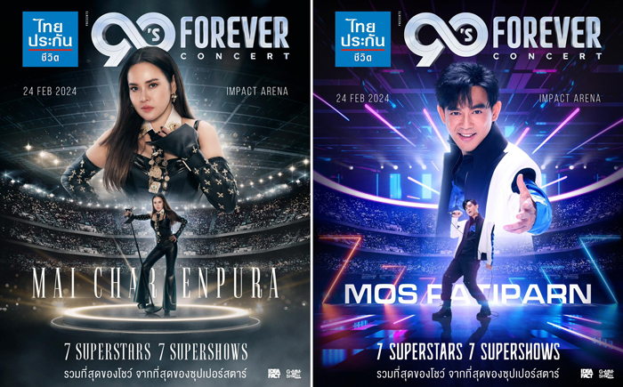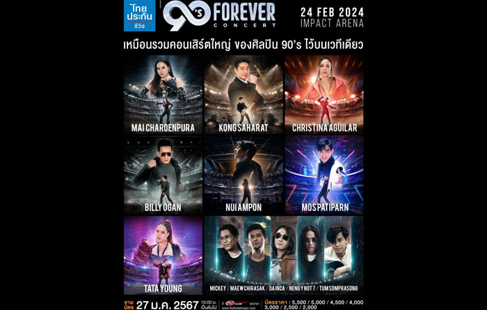 พร้อมสร้างตำนานกันตั้งแต่ต้นปีหลังจากที่ทาง Facebook เพจคอนเสิร์ต: 90’s – 2000’s Concerts ได้ทยอยปล่อย ภาพศิลปิน ยุค 90’s ที่จะมาขึ้นคอนเสิร์ตในครั้งนี้ เพื่อโปรโมทออกมาเรียกน้ำย่อยแฟน ๆ อย่างต่อเนื่อง จนทำให้แฟนเพลงสาวกยุค 90’s ต่างใจจดใจจ่อตั้งตารอคอย การกลับมาของศิลปินที่เป็นระดับตำนานในดวงใจ ล่าสุดทางผู้จัดคอนเสิร์ต ‘GMM SHOW’ พร้อมแล้วที่จะส่งความสนุกสุดมันส์ ที่ในครั้งนี้อาจเป็นครั้งแรกและครั้งเดียว ที่ศิลปินระดับตำนานทั้ง 7 คนจะมาอยู่บนเวทีเดียวกันใน ‘ไทยประกันชีวิต presents 90’s FOREVER CONCERT’ จะจัดขึ้นในวันเสาร์ที่ 24 กุมภาพันธ์ 2567 ณ อิมแพ็ค อารีน่า เมืองทองธานี
