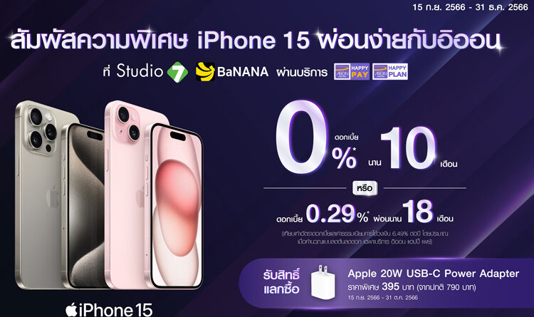 โปรโมชัน iPhone 15 ที่อิออนจัดมาเพื่อลูกค้าคนพิเศษให้ได้สัมผัสประสบการณ์สมาร์ตโฟนสุดล้ำได้ง่ายยิ่งขึ้นกับแผนการผ่อนชำระสบายๆ และพิเศษยิ่งขึ้น สำหรับลูกค้าบัตรอิออนเท่านั้น เลือกผ่อนชำระตามโปรแกรม ยังได้รับสิทธิ์แลกซื้อ Apple 20W USB-C Power Adapter ในราคาพิเศษ เพียง 395 บาท (จากราคาปกติ 790 บาท) สิทธิพิเศษนี้ ถึงวันที่ 31 ตุลาคม 2566 เท่านั้น* สนใจรับข้อเสนอพิเศษจากอิออนได้ที่ร้าน Studio7 และ Banana ทุกสาขา โดย iPhone 15 เปิดให้ผู้สนใจสั่งซื้อล่วงหน้าได้ตั้งแต่วันที่ 15 กันยายน 2566 และเริ่มวางจำหน่ายอย่างเป็นทางการตั้งแต่วันที่ 22 กันยายน 2566