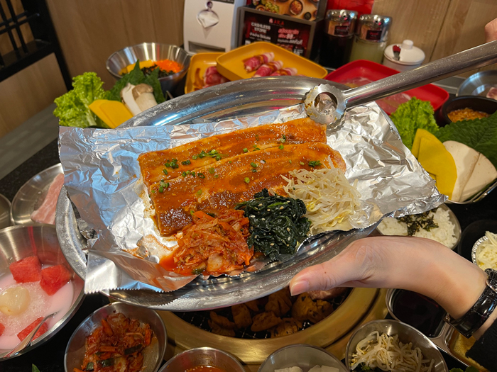 · ซัมกยอบซัล หมูสามชั้นย่างบนฟอยล์ หมูสามชั้นหมักซอสสไปซี่โกชูจัง ยกย่างทั้งฟอยล์ ผัดรวมกับกิมจิ นามุรุผักโขม และนามุรุถั่วงอก อร่อยครบรส เคี้ยวสนุกมันส์ทุกคำ
