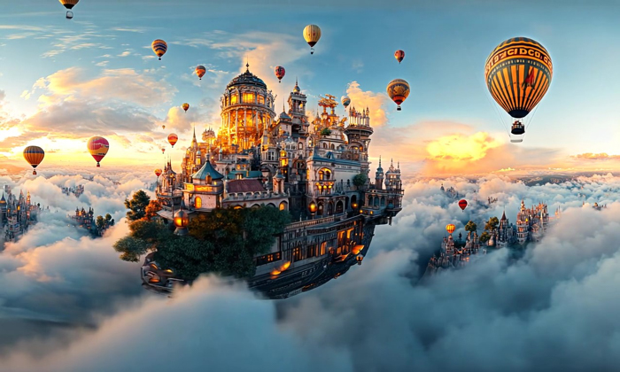 Prompt : สร้างวิดีโอ ภาพนิ่งมุมกว้าง wide angle: เมืองโบราณลอยฟ้ากลางหมู่เมฆ สถาปัตยกรรมแบบแฟนตาซี มีสะพานเชื่อมต่อกันระหว่างอาคาร มีบอลลูนลอยอยู่รอบๆ แสงสีทองส่องสว่างทั่วเมือง สไตล์ภาพแบบ Art Nouveau เลนส์ fisheye รายละเอียดสูง สีสดใส ดนตรีประกอบแนว ambient