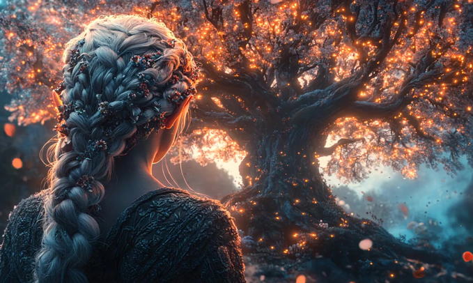 Prompt: สร้างวิดีโอ over the shoulder: ราชินีเอลฟ์กำลังมองดูต้นไม้โลกขนาดมหึมาที่เปล่งประกาย กิ่งก้านสาขาของต้นไม้สั่นไหวปกคลุมไปด้วยดอกไม้นานาพันธุ์ สไตล์ภาพแฟนตาซี รายละเอียดสูง แสงนุ่มนวล เสียงดนตรีประกอบแนว Celtic Music