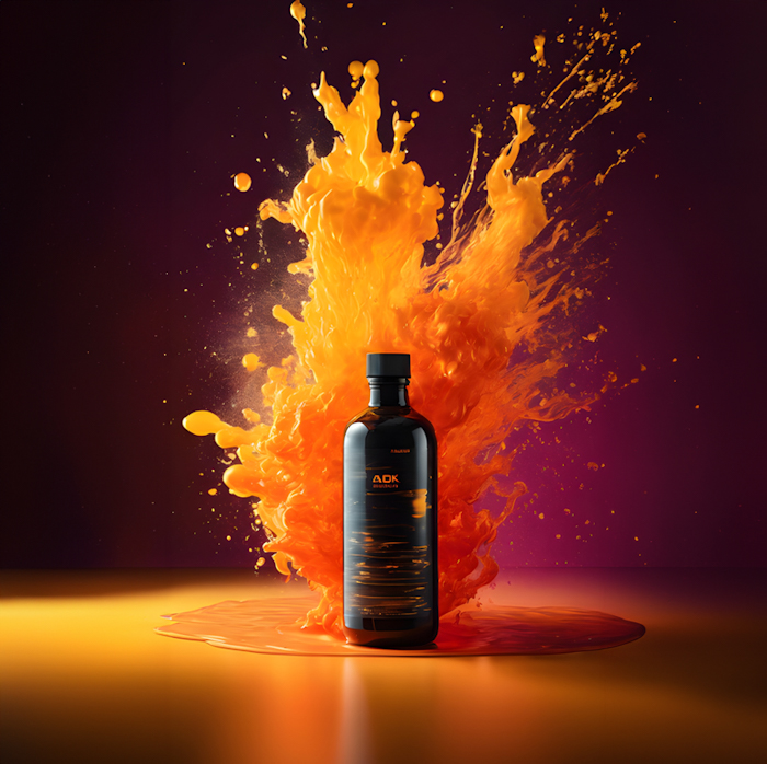 Prompt : สร้างภาพขวดโทนเนอร์ลอยอยู่ในน้ำ พื้นหลังขาว จัดแสงแบบสตูดิโอ ความละเอียดสูง เน้นโทนสีเหลืองและส้ม ให้ภาพมีความเคลื่อนไหวเหมือนของเหลวระเบิดออกมา สื่ออารมณ์ภาพแบบ Surrealism ขนาด 9:16