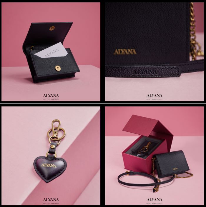 ALYANA Anniversary Boxset เป็นรุ่น Limited Edition ได้รับแรงบันดาลใจมาจากความรักรอบๆ ตัวที่ส่งผ่านให้กันในทุกๆ วัน ทางแบรนด์จึงตั้งใจทำกระเป๋าที่มีเอกลักษณ์เฉพาะตัว พร้อมใช้งานทั้งแบบถอดสายโซ่ออกและใช้เป็นกระเป๋าสตางค์ รวมถึงสามารถปรับรูปแบบการใช้งานได้หลายโอกาส ให้ Mix & Match กับทุกสไตล์การแต่งตัว ถูกใจสายแฟชั่นอย่างแน่นอน และยังมีความพิเศษในคอลเลกชั่นนี้คือ The mini heart keychain charm พวงกุญแจรูปหัวใจ อีกหนึ่งเครื่องประดับที่มาคู่กันเพิ่ม Gimmick เป็นอีกสไตล์แฟชั่น ที่คนรักการแต่งตัวไม่ควรพลาด