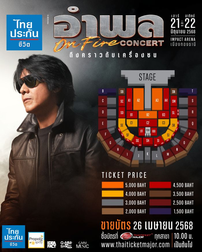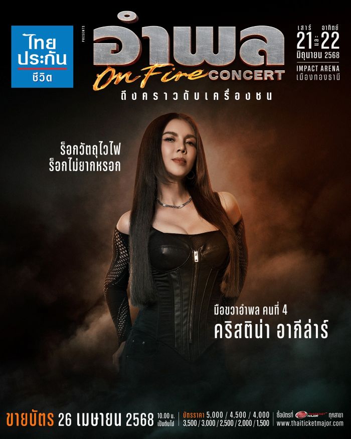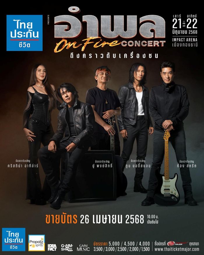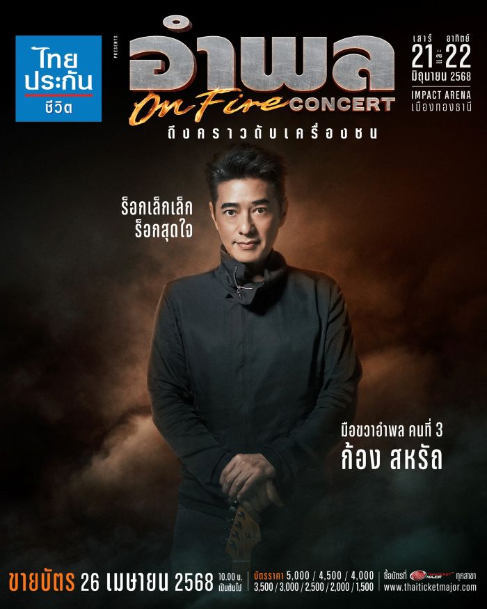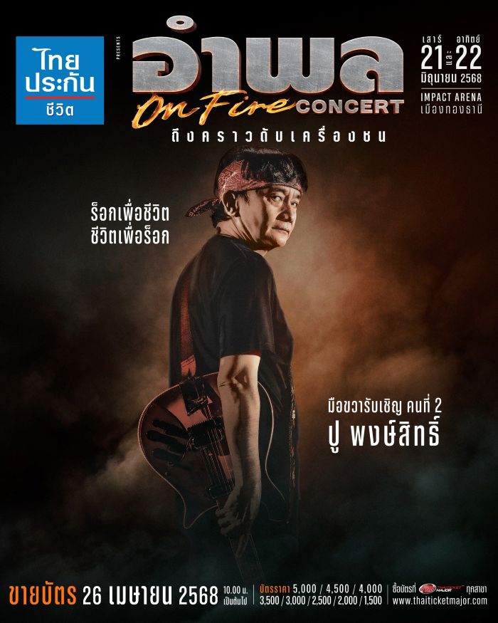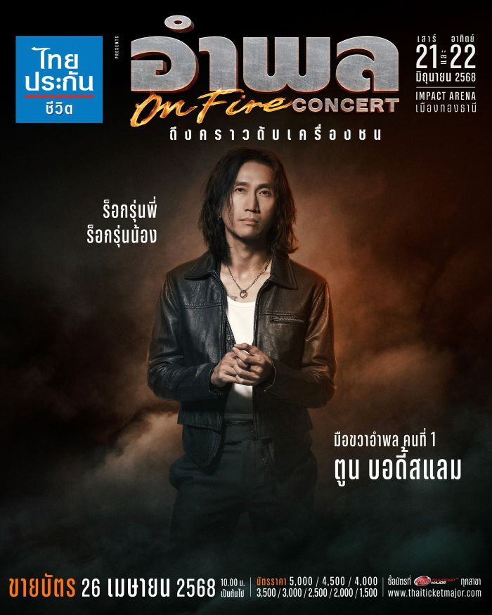“ไทยประกันชีวิต presents อำพล ON FIRE คอนเสิร์ต ถึงคราวดับเครื่องชน” พร้อมชวนชาวร็อกมือขวา มาสัมผัสความมันทะลุจุดเดือดไปพร้อมกัน ในวันเสาร์ที่ 21 และวันอาทิตย์ที่ 22 มิถุนายน 2568 ณ อิมแพ็ค อารีน่า เมืองทองธานี