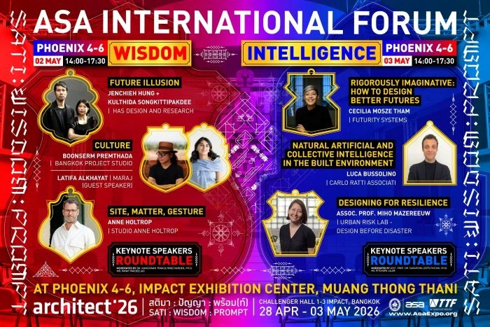 นิทรรศการ ASA ALL MEMBER – Thailand Only : สะท้อนสถาปัตยกรรมกับบริบทไทยไทย ตามด้วย ASA EMERGING YOUNG ARCHITECTS IN THE AGE OF NEW DISRUPTIONS นิทรรศการแสดงผลงานของสถาปนิกคลื่นลูกใหม่ในยุคแห่งความเปลี่ยนแปลง ชี้ให้เห็นศักยภาพ แนวคิด และบทบาทที่กําลังเปลี่ยนแปลงของนักออกแบบร่วมสมัย ในการมีส่วนกําหนดทิศทางของสังคมไทยควบคู่ไปกับบริบทระดับนานาชาติ ส่วนที่ 2 FORUM แบ่งเป็น 2 กลุ่ม คือ 1.สัมมนาระดับนานาชาติ ASA INTERNATIONAL FORUM งานสัมมนาทางสถาปัตยกรรมที่รวบรวม Keynote Speakers ระดับนานาชาติ มาร่วมนําเสนอและแลกเปลี่ยนแนวคิดที่สะท้อนความสัมพันธ์ระหว่าง “WISDOM” (ปัญญามนุษย์) และ “NEW INTELLIGENCE” (ปัญญาใหม่) ผ่านมุมมองและประสบการณ์ของสถาปนิกผู้มีชื่อเสียงระดับนานาชาติ ในหลากหลายหัวข้อน่าสนใจ ซึ่งสัมมนานี้จะจัดเพียง 2 วันระหว่างวันที่ 2 และ 3 พฤษภาคม 2569 ณ ห้องฟินิกซ์ 4-6 อาคารแสดงสินค้า อิมแพ็ค เมืองทองธานี