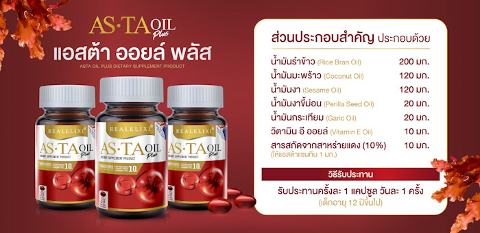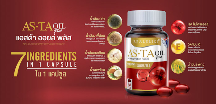 ทั้งนี้ผลิตภัณฑ์อาหารเสริม “Asta Oil Plus” อุดมไปด้วยสารสกัดจากธรรมชาติ 7 ชนิด ที่มีประโยชน์ต่อร่างกายอัดแน่นไว้ใน 1 แคปซูล ไม่ว่าจะเป็น Virgin Coconut Oil (น้ำมันมะพร้าวสะกัดเย็น),Rice Bran Oil (น้ำมันรำข้าวและจมูกข้าว), Garlic Oil (น้ำมันกระเทียม), Perilla Oil (น้ำมันงาขี้ม่อน), Sesame Oil (น้ำมันงาดำ), Vitamin E และ Red Microalgae (เรด ไมโครแอลจี้) โดยมีคุณสมบัติต่อต้านอนุมูลอิสระ ช่วยการไหลเวียนของระบบเลือดให้ดีขึ้น ทำให้สามารถลดคลอเรสโตรอล, ความดันโลหิต ซึ่งเป็นสาเหตุหลักของการเกิดโรคหัวใจในหลอดเลือด และค่าน้ำตาลในเลือดซึ่งเป็นสาเหตุของโรคเบาหวาน
