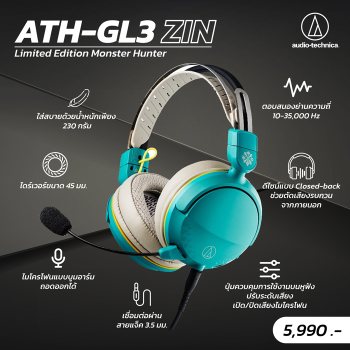 Audio-Technica ATH-GL3 ZIN หูฟังครอบหูที่ได้รับแรงบันดาลใจในการออกแบบมาจาก Zinogre ซึ่งเป็นหนึ่งในมอนสเตอร์ยอดฮิตจากเกม Monster Hunter มีจุดเด่นอยู่ที่น้ำหนักเบาเพียง 230 กรัม ทำให้สามารถใส่เล่นเกมได้อย่างสบายตลอดทั้งวันโดยไม่เจ็บหู ด้วยดีไซน์แบบ Closed-back ที่ช่วยตัดเสียงรบกวนภายนอกและยังช่วยให้แยกทิศทางของเสียงได้อย่างชัดเจน นอกจากนี้ยังโดดเด่นด้วยการถ่ายทอดรายละเอียดเสียงที่คมชัดด้วยไดร์เวอร์ขนาด 45 มิลลิเมตร รวมถึงไมโครโฟนแบบบูมอาร์มที่ถอดออกได้ สามารถรับเสียงได้จากทุกทิศทางและสื่อสารกับเพื่อร่วมทีมได้อย่างชัดเจน มาพร้อมความสดใสของสีเขียวเทอร์ควอยซ์ที่ตัดกับสีเงินและสีครีมได้อย่างลงตัว โดยตัวเอียร์แพดและเฮดแพดสามารถถอดออกเพื่อเปลี่ยนได้ รวมถึงปุ่มควบคุมการใช้งานบนหูฟังด้านซ้าย จะช่วยควบคุมการรับสาย ปรับระดับเสียง และเปิด/ปิดเสียงไมโครโฟนได้อย่างสะดวกสบาย ทั้งยังรองรับการใช้งานกับ PC และเครื่องเล่นเกม Console เช่น PS5 และ Xbox Series X รวมถึงเกมมิ่งคอนโซลอื่นๆ นอกจากนี้หูฟังรุ่น ATH-GL3 ZIN ยังสามารถใช้สำหรับฟังเพลง รวมถึงใช้งานในรูปแบบ Monitor Headphones สำหรับตัดต่อหรือทำเพลงในแบบ Bedroom Studio ได้ด้วย วางจำหน่ายในราคา 5,990 บาท โดยภายในกล่องจะมีสติ๊กเกอร์ที่เป็น Limited Edition มาให้อีกด้วย