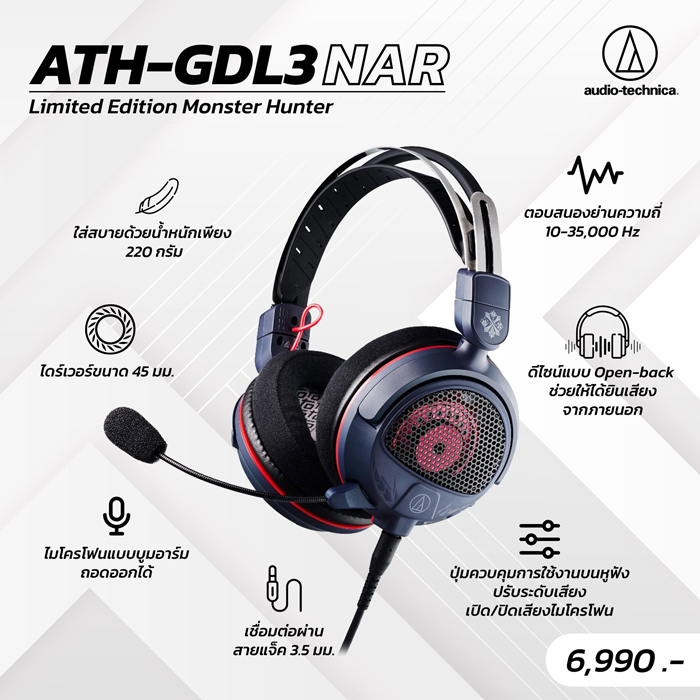 Audio-Technica ATH-GDL3 NAR เป็นหูฟังครอบหูที่ได้รับแรงบันดาลใจในการออกแบบมาจาก Nargacuga อีกหนึ่งมอนสเตอร์ยอดฮิตจากซีรีย์เกม Monster Hunter มีจุดเด่นอยู่ที่น้ำหนักที่เบาเพียง 220 กรัม ทำให้สามารถใส่เล่นเกมได้อย่างสบายตลอดทั้งวันโดยไม่เจ็บหู ด้วยดีไซน์แบบ Open-back จะช่วยให้ได้ยินเสียงจากภายนอกและยังช่วยให้ได้ยินเสียงและเอฟเฟกต์ต่างๆได้รอบทิศทาง ทำให้สามารถจับทิศทางคู่ต่อสู้และมอนสเตอร์ได้อย่างแม่นยำ ทั้งยังมาพร้อมไดร์เวอร์ขนาด 45 มิลลิเมตร จะช่วยมอบเสียงที่คมชัดและมีรายละเอียดมากยิ่งขึ้น พร้อมไมโครโฟนแบบบูมอาร์มที่ถอดได้ ทำให้สามารถรับเสียงได้จากทุกทิศทาง รวมถึงสามารถสื่อสารกับเพื่อนร่วมทีมได้อย่างชัดเจน โดยตัวหูฟังมาในโทนสีดำตัดกับสีแดงและสีเงินได้อย่างลงตัว มาพร้อมเอียร์แพดและเฮดแพดที่สามารถถอกออกเพื่อเปลี่ยนได้ รวมถึงปุ่มควบคุมการใช้งานบนหูฟังด้านซ้ายที่ช่วยควบคุมการรับสาย ปรับระดับเสียง และเปิด/ปิดเสียงไมโครโฟนได้อย่างสะดวกสบาย ทั้งยังรองรับการใช้งานกับ PC และเครื่องเล่นเกม Console เช่น PS5, Xbox Series X และเกมมิ่งคอนโซลอื่นๆ นอกจากนี้ ATH-GDL3 NAR ยังสามารถใช้สำหรับฟังเพลง รวมถึงใช้งานในรูปแบบ Monitor Headphones สำหรับตัดต่อหรือทำเพลงในแบบ Bedroom Studio ได้ด้วย วางจำหน่ายในราคา 6,990 บาท โดยภายในกล่องจะมีสติ๊กเกอร์ที่เป็น Limited Edition มาให้อีกด้วย