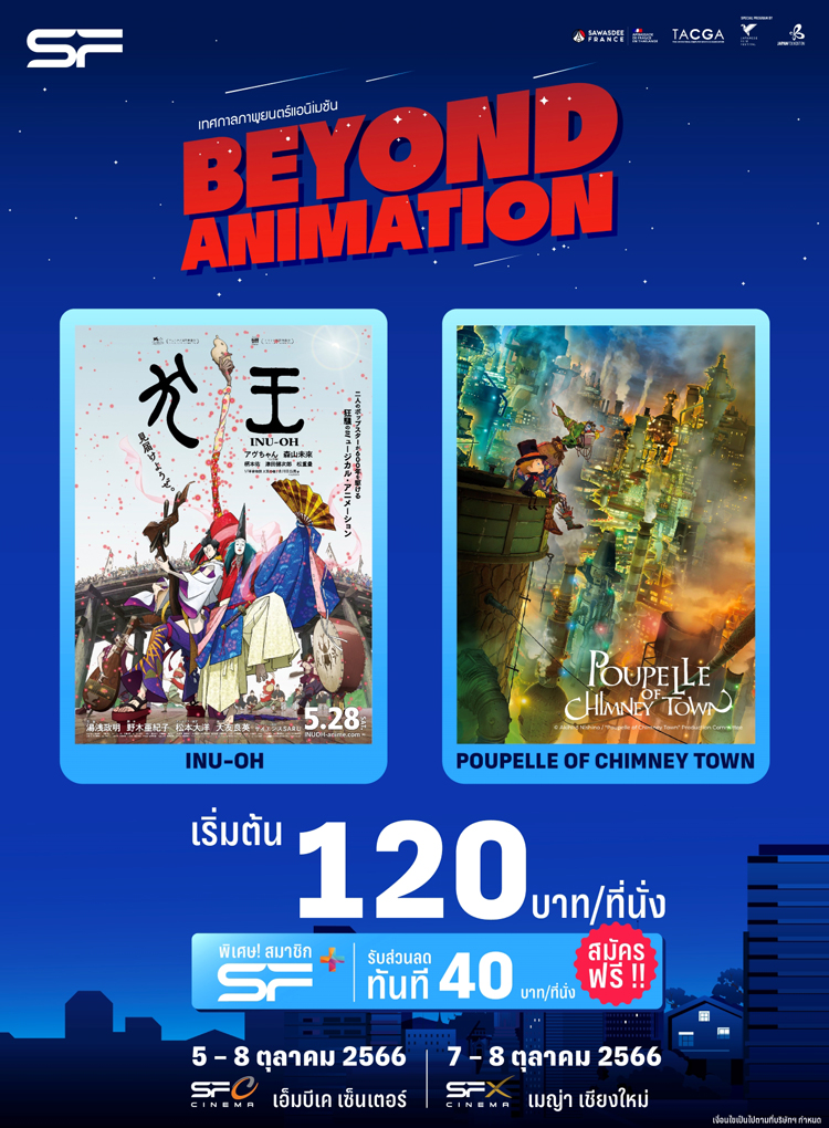 โรงภาพยนตร์ในเครือ เอส เอฟ ร่วมกับ สถานเอกอัครราชทูตฝรั่งเศสประจำประเทศไทย สร้างสีสันให้วงการหนังกับ “เทศกาลภาพยนตร์แอนิเมชัน Beyond Animation 2023” นำภาพยนตร์แอนิเมชันเรื่องดัง 2 เรื่อง ได้แก่ inu-oh (อินุโอ) และ Poupelle of Chimney Town มาให้เลือกรับชมกัน ในราคาเริ่มต้นที่นั่งละ 120 บาท ระหว่างวันที่ 5-8 ตุลาคม 2566 ณ โรงภาพยนตร์ เอส เอฟ ซีเนม่า สาขา เอ็มบีเค เซ็นเตอร์ และชาวเชียงใหม่สามารถรับชมได้ ระหว่างวันที่ 7-8 ตุลาคม 2566 ณ โรงภาพยนตร์ เอส เอฟ เอ็กซ์ ซีเนม่า เมญ่า ไลฟ์สไตล์ ช้อปปิ้ง เซ็นเตอร์ เชียงใหม่