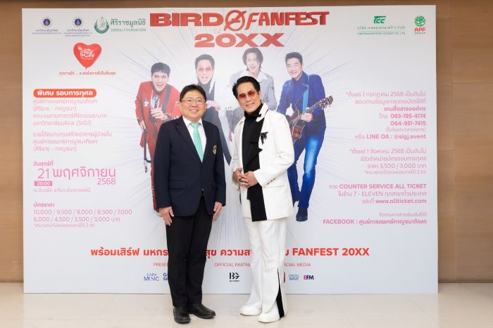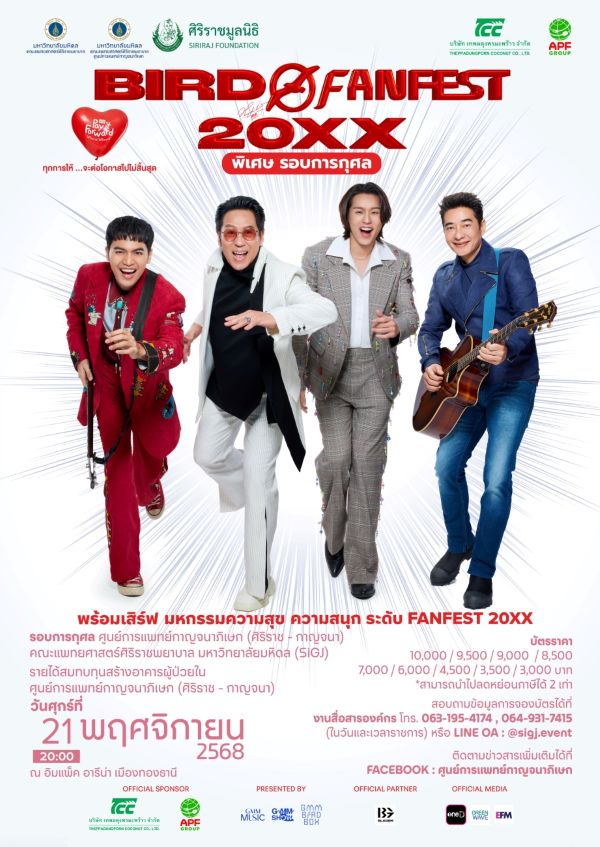 ศูนย์การแพทย์กาญจนาภิเษก คณะแพทยศาสตร์ศิริราชพยาบาล มหาวิทยาลัยมหิดล (SiGJ) เชิญชวนคนไทยร่วมมอบ “โอกาส” ทางการรักษาให้กับผู้ป่วย ด้วยการซื้อบัตรคอนเสิร์ต “BIRD FANFEST 20XX” รอบการกุศล : ศูนย์การแพทย์กาญจนาภิเษก คณะแพทยศาสตร์ศิริราชพยาบาล มหาวิทยาลัยมหิดล ส่งผ่านความสุขและรอยยิ้มโดยศิลปินซูเปอร์สตาร์ขวัญใจคนทุกวัยเบิร์ด ธงไชย แมคอินไตย์ ในรอบการแสดงวันศุกร์ที่ 21 พฤศจิกายน 2568 เวลา 20.00 น. ณ อิมแพ็ค อารีน่า เมืองทองธานี รายได้จากการจำหน่ายรอบดังกล่าว จะนำไปสมทบทุนสร้างอาคารหอผู้ป่วยใน ศูนย์การแพทย์กาญจนาภิเษก คณะแพทยศาสตร์ศิริราชพยาบาล มหาวิทยาลัยมหิดล