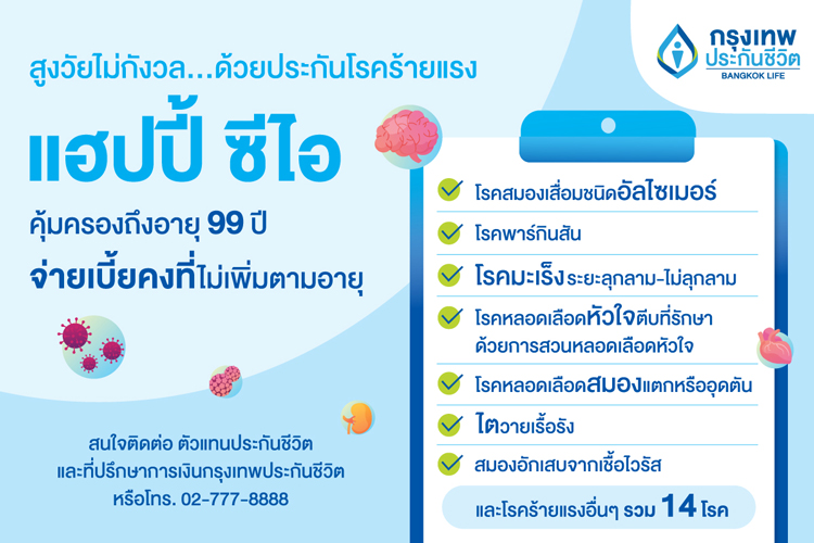 กรุงเทพประกันชีวิต ร่วมรณรงค์เนื่องในวันอัลไซเมอร์โลก 21 กันยายน ของทุกปี ชวนคนไทยตระหนักถึงการใส่ใจสุขภาพ พร้อมวางแผนการดูแลและเตรียมรับมือเพื่อเข้าถึงการรักษาที่เหมาะสม ผ่านแบบประกัน แฮปปี้ ซีไอ ที่ช่วยสร้างความอุ่นใจด้วยผลประโยชน์ที่คุ้มค่า ให้ความคุ้มครองโรคร้ายแรงรวมถึงโรคสมองเสื่อมชนิดอัลไซเมอร์ที่พบเพิ่มมากขึ้นในผู้สูงอายุ รับเงินก้อน 100% ของจำนวนเงินเอาประกันภัย หรือเบี้ยประกันภัยที่ชำระแล้วสะสมตามจริงแล้วแต่จำนวนใดจะมากกว่า ไม่ว่าจะเป็นโรคร้ายแรงระหว่างสัญญา หรือมีชีวิตอยู่จนครบกำหนดสัญญา พร้อมอุ่นใจกับความคุ้มครองยาวนานถึงอายุ 99 ปี ด้วยเบี้ยประกันภัยคงที่ตลอดสัญญา