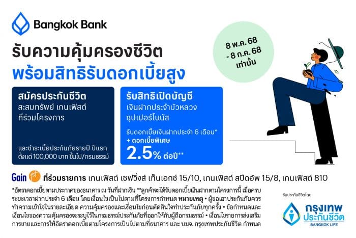 กรุงเทพประกันชีวิต ร่วมกับ ธนาคารกรุงเทพ ออกโครงการพิเศษ ‘Gain & Save ส่งมอบความคุ้มครองชีวิตพร้อมรับสิทธิ์ดอกเบี้ยพิเศษ’ ตอบโจทย์ลูกค้าออมระยะสั้นและระยะยาว ลดความเสี่ยงจากตลาดทุนผันผวน-ดอกเบี้ยต่ำ พร้อมให้ผลตอบแทนสม่ำเสมอ ด้วยประกันชีวิตสุดฮิต 3 แบบ เกนเฟิสต์ 810 เกนเฟิสต์ สปีดอัพ 15/8 และเกนเฟิสต์ เซฟวิ่งส์ เท็นเอกซ์ 15/10 จ่ายเบี้ยรายปีเริ่มต้น 100,000 บาท รับสิทธิ์เปิดบัญชีเงินฝากประจำ 6 เดือน บัวหลวงซุปเปอร์โบนัส รับดอกเบี้ยอัตราพิเศษเพิ่มอีก 2.5% ต่อปี เริ่มตั้งแต่วันที่ 8 พฤษภาคม – 8 กรกฎาคม 2568