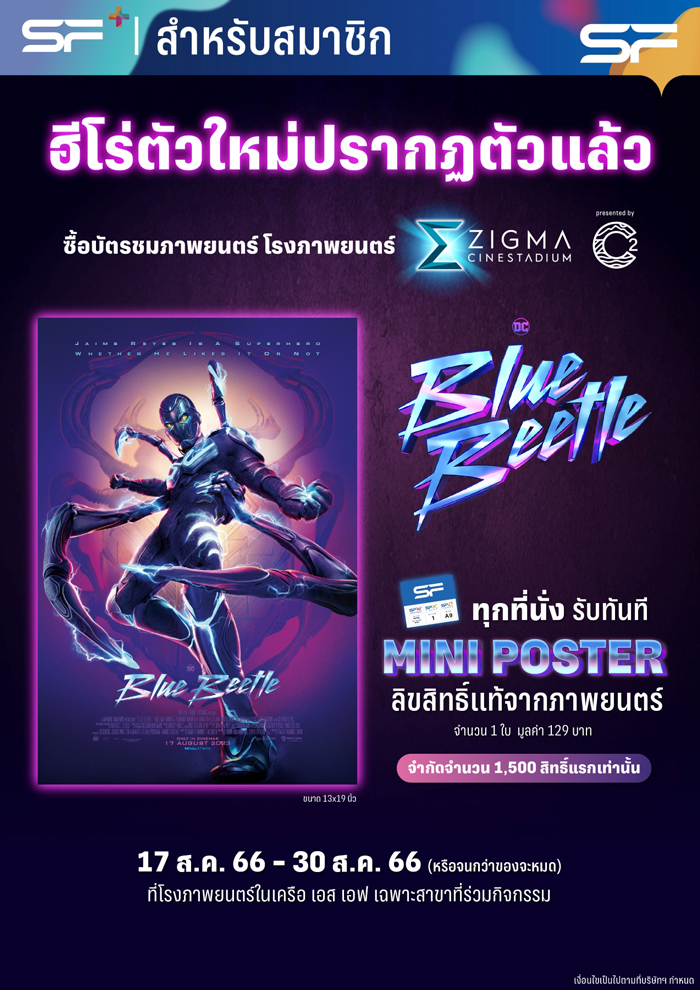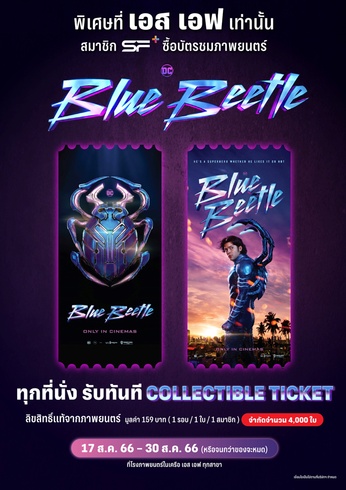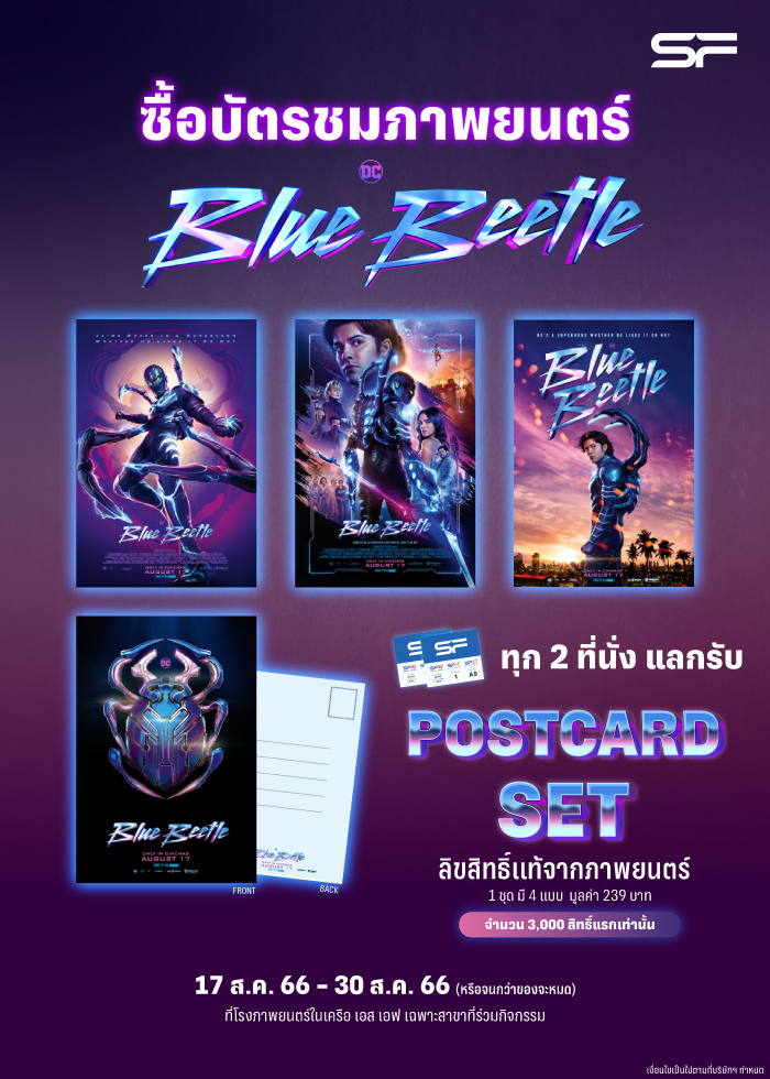 โรงภาพยนตร์ในเครือ เอส เอฟ ต้อนรับภาพยนตร์ซูเปอร์ฮีโร่คนใหม่แห่งจักรวาล DC กับ “BLUE BEETLE (บลู บีเทิล)” จัดเต็มแคมเปญเพื่อลูกค้า เอส เอฟ เท่านั้น เพียงซื้อบัตรชมภาพยนตร์ทุก 2 ที่นั่ง โรงภาพยนตร์ปกติ รับโปสการ์ด เซ็ท 1 ชุด (จำกัด 3,000 สิทธิ์) ตั้งแต่วันที่ 17-30 สิงหาคม 2566 เป็นต้นไป (หรือจนกว่าของที่ระลึกจะหมด)