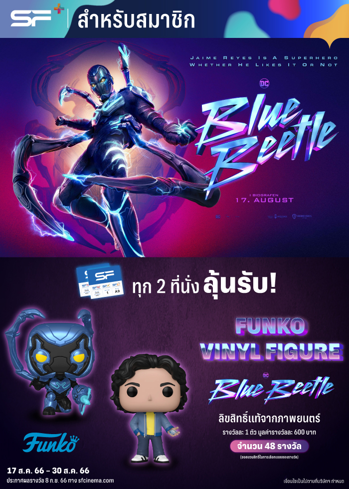 นอกจากนี้ สำหรับสมาชิก SF+ ซื้อบัตรชมภาพยนตร์ทุก 2 ที่นั่ง รับสิทธิ์ลุ้น FUNKO VINYL FIGURE BLUE BEETLE ลิขสิทธิ์แท้ 1 ตัว รางวัลละ 600 บาท รวมทั้งสิ้น 48 รางวัล ตั้งแต่วันที่ 17-30 สิงหาคม 2566 ประกาศผลผู้โชคดีวันที่ 8 กันยายน 2566