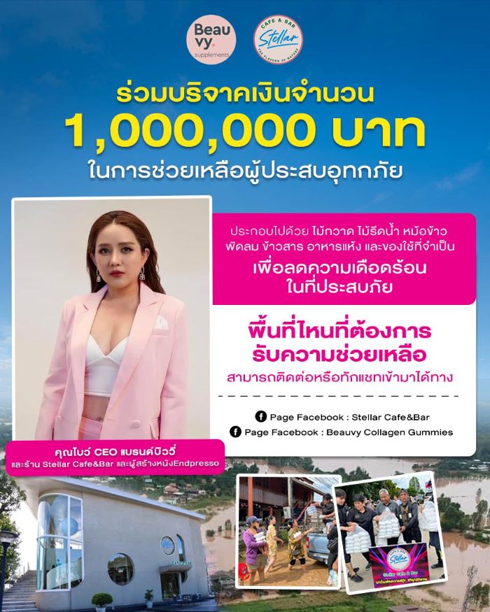 โดย คุณโบว์ เผยทั้งน้ำตา (ซึมๆ) กับการช่วยเหลือพ่อแม่พี่น้องชาวเชียงรายในครั้งนี้ว่า “เห็นความเดือดร้อนของคนเชียงรายแล้ว รู้สึกหดหู่ใจเป็นอย่างมาก ก็ตั้งใจเลยว่าจะต้องช่วยเหลืออย่างที่สุด โบว์ลงพื้นที่ไปกับทีมงาน เห็นสภาพบ้านของพ่อแม่พี่น้องที่ได้รับความเดือดร้อน ยอมรับว่า อึ้ง ค่ะ หลายๆ บ้านไม่เหลืออะไรเลย เศร้ามาก ด้วยเจตนารมณ์ของโบว์คือ เราไปทำธุรกิจที่เชียงราย มีโอกาสซื้อบ้าน และเปิดร้านกาแฟ Stellar Cafe&Bar ด้วย พอมาวันนี้คนเชียงรายได้รับความเดือดร้อน จึงอยากลงไปช่วยเหลือ และลงพื้นที่เอง เพราะอยากเข้าถึงผู้ที่ประสบภัยน้ำท่วมจริงๆ อย่างเร่งด่วน