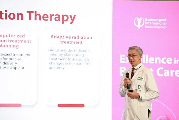 นพ. หฤษฎ์ สุวรรณรัศมี แพทย์ชำนาญการด้านมะเร็งวิทยา โรงพยาบาลบำรุงราษฎร์ อธิบายว่า การรักษาผู้ป่วยมะเร็งเต้านมมีหลายวิธี เช่น การผ่าตัด การให้ยาเคมี การฉายแสง การให้ยาต้านฮอร์โมน การให้ยามุ่งเป้า และการให้ยากลุ่มภูมิคุ้มกันบำบัด ซึ่งการให้ยาผู้ป่วยหลังผ่าตัดมะเร็งเต้านมจะช่วยลดโอกาสของการกลับมาเป็นซ้ำ โดยบำรุงราษฎร์มียาที่ได้รับการรับรองข้อบ่งใช้ในโรคมะเร็งแต่ละชนิดอย่างครอบคลุม โดยเราจะเลือกยาให้เหมาะกับผู้ป่วยแต่ละราย นอกจากนี้ เรายังมีการตรวจการแสดงออกของยีนในตัวมะเร็ง (Genomic risk) เพื่อบอกโอกาสการกลับมาเป็นซ้ำหลังผ่าตัดมะเร็งเต้านม และหากเป็นมะเร็งเต้านมระยะเริ่มต้น การตรวจยีนจะช่วยทำให้เรารู้ว่าหากต้องให้ยาเคมีบำบัด ผู้ป่วยจะได้รับประโยชน์จากการให้ยาหรือไม่ ซึ่งเป็นการรักษาแบบ Precision Oncology ทำให้แพทย์สามารถเจาะจงใช้ยารักษามะเร็งที่เหมาะสม พร้อมวางแผนหลีกเลี่ยงผลข้างเคียงที่มีโอกาสเกิดขึ้นได้ตั้งแต่แรก