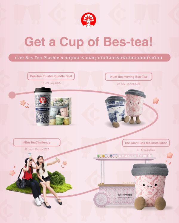 ความสนุกยังไม่หมดแค่นี้ เพราะทุกสัปดาห์ CHAGEE จะส่งมาสคอต Bes-tea ออกไปสร้างความสุขตามจุดต่างๆ รอติดตามโพสต์บนโซเชียลมีเดียและ IG Stories ของ CHAGEE มาสคอต Bes-tea จะไปโผล่ที่ไหน ใครที่เจออย่าลืมถ่ายรูปหรือวิดีโอ โพสต์ลง Instagram หรือ TikTok พร้อมแท็ก @chagee.th และ #BesTeaGoAround #BesTeaPlushie #chageeth โพสต์ที่โดนใจทีมงาน CHAGEE มากที่สุด 8 โพสต์ในแต่ละสัปดาห์ จะได้รับตุ๊กตา Bes-tea รุ่นลิมิเต็ดขนาดกลางไปเลย!