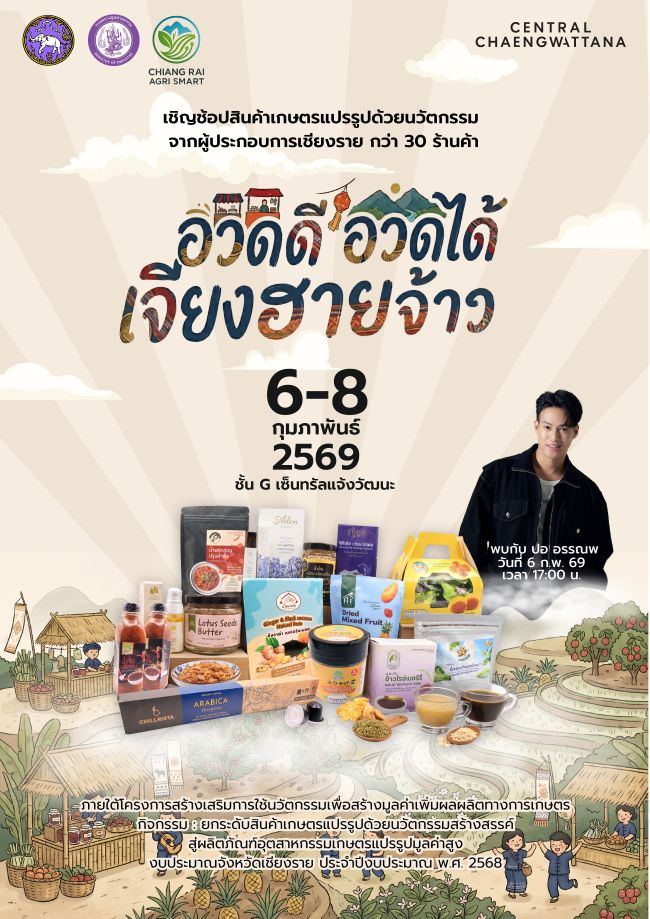 อย่าพลาด!!!! ช้อป ชิม สินค้าดาวเด่นจากจังหวัดเชียงรายในงาน “อวดดี อวดได้ เจียงฮายจ้าว” ระหว่างวันที่ 6-9 กุมภาพันธ์ 2569 เวลา 10.30 – 22.00 น. ณ บริเวณ ลานโปรโมชั่น PGA ชั้น G เซ็นทรัลแจ้งวัฒนะ อำเภอปากเกร็ด จังหวัดนนทบุรี