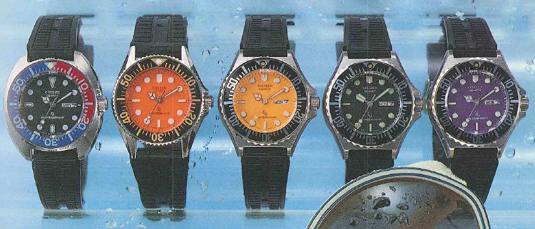 นาฬิกาดำน้ำหลายเรือนในแค็ตตาล็อก CITIZEN ในช่วงเวลานี้ประกอบด้วยนาฬิการุ่นต่างๆ ที่มีหน้าปัดสีสันสดใส และมีตัวอย่างมากมายที่เห็นได้ทั่วไป โดยที่สีน้ำเงิน สีส้ม และสีเหลืองเป็นรุ่นที่ได้รับความนิยมมากที่สุดนอกเหนือจากหน้าปัดสีดำมาตรฐาน