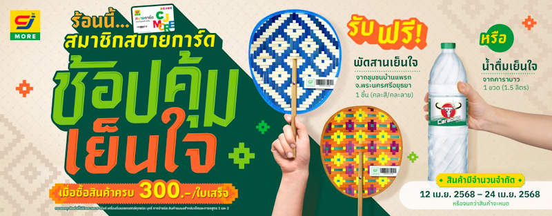 พิเศษไปกว่าเดิม! สำหรับลูกค้าสมาชิกสบายการ์ด สงกรานต์นี้ ซีเจ มอร์ มีของขวัญชิ้นพิเศษมามอบให้ เพียงช้อปครบ 300 บาท/ใบเสร็จ รับฟรีทันที “พัดสานเย็นใจ” งานฝีมือจากชุมชนบ้านแพรก จ.พระนครศรีอยุธยา ที่สานด้วยใจจากสมาชิกในชุมชน ทุกเส้นสายของพัดถูกร้อยเรียงด้วยความประณีตและความตั้งใจ ซีเจ มอร์ ขอเป็นส่วนหนึ่งในการสนับสนุนภูมิปัญญาท้องถิ่น ส่งต่องานหัตถกรรมสุดล้ำค่านี้ไปสู่ลูกค้าทุกคนในเทศกาลสงกรานต์นี้ หรือจะเลือกรับ น้ำดื่มคาราบาว ขนาด 1.5 ลิตร เพื่อเติมความสดชื่นในวันสงกรานต์ก็ได้เช่นกัน ตั้งแต่วันที่ 12-24 เมษายน 2568 (หรือจนกว่าสินค้าจะหมด)