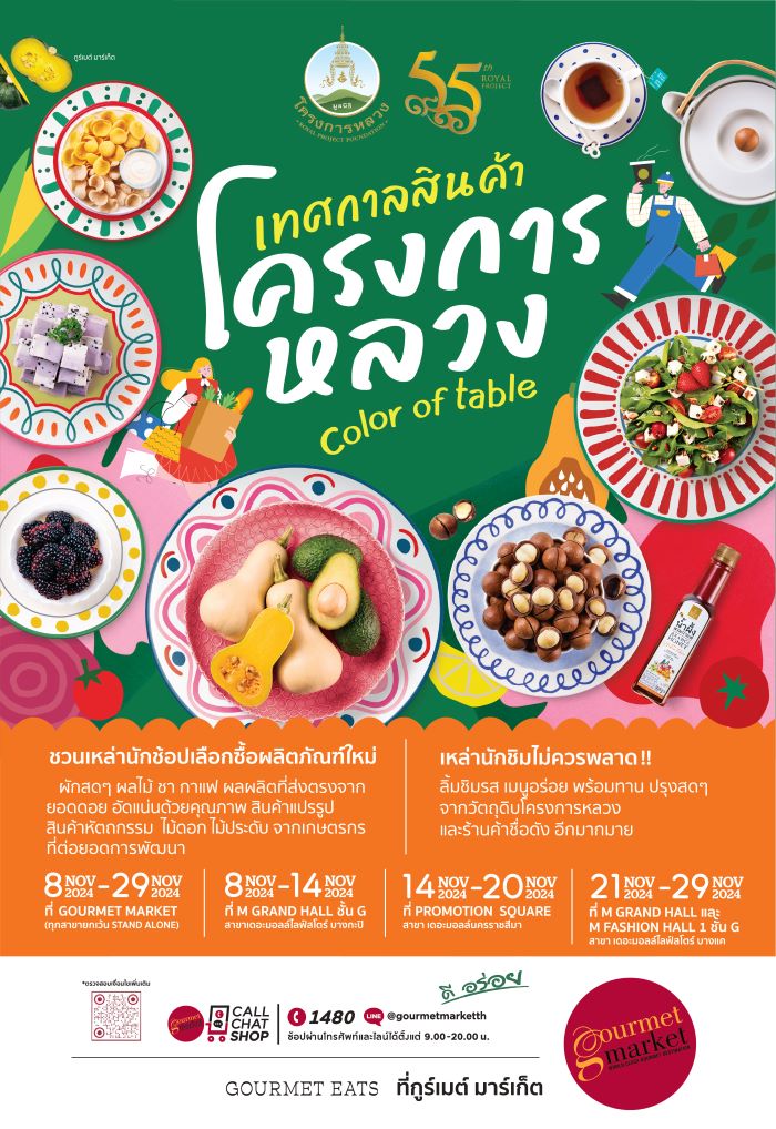 มูลนิธิโครงการหลวง ร่วมกับ กูร์เมต์ มาร์เก็ต พรีเมียมซูเปอร์มาร์เก็ตระดับเวิลด์คลาส และ กูร์เมต์ อีทส์ ศูนย์รวมความอร่อยตอบโจทย์ทุกไลฟ์สไตล์ ในเครือเดอะมอลล์ กรุ๊ป จัดงาน “เทศกาลโครงการหลวง 2567” ชวนช้อปหลากหลายสินค้าคุณภาพส่งตรงจากยอดดอย คอนเซ็ปต์ “Color of Table สีสันชาวดอย” ทั้งผัก-ผลไม้ 5 สี อาทิ คอสสลัด, ฟักทองญี่ปุ่นมินิ, อะโวคาโด, เคพกูสเบอร์รี่, มะเขือเทศเชอร์รี่ และเสาวรสหวาน, ชา, กาแฟ, ผลิตภัณฑ์แปรรูป เช่น เฟต้าชีสนมควายผสมนมแพะ, ไข่ไก่อินทรีย์, น้ำสลัด, สินค้าหัตถกรรม, ไม้ดอก-ไม้ประดับ