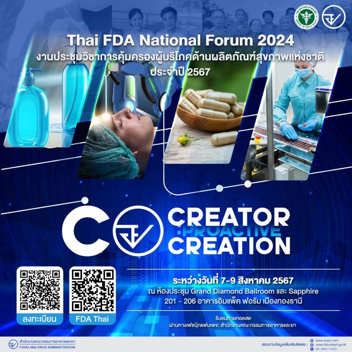 สํานักงานคณะกรรมการอาหารและยา (Thai FDA) ได้จัดงาน “CREATOR PROACIIVE CREATION” งานประชุมวิชาการคุ้มครองผู้บริโภคด้านผลิตภัณฑ์สุขภาพแห่งชาติ ประจําปี 2567 หรือ Thai FDA National Forum 2024 ณ ห้องประชุม Grand Diamond Ballroom และ Sapphire 201 – 206 อาคารอิมแพ็ค ฟอรัม เมืองทองธานี ในระหว่างวันที่ 7-9 สิงหาคม 2567 โดยมีวัตถุประสงค์หลักเพื่อขับเคลื่อนเศรษฐกิจของภาครัฐซึ่งเป็นหนึ่งในกลไกที่สําคัญของการพัฒนาประเทศตามยุทธศาสตร์ชาติ พ.ศ. 2561- 2580 และปรับสมดุลพัฒนาระบบการบริหารจัดการภาครัฐให้พร้อมรับการเปลี่ยนแปลงของโลก