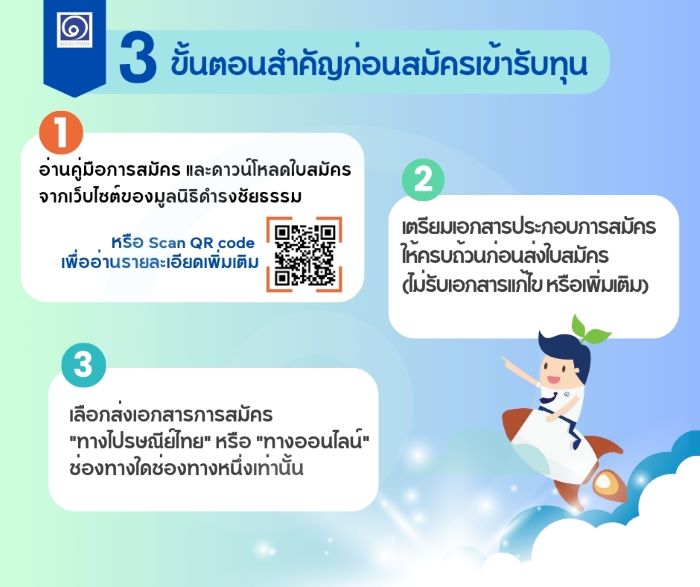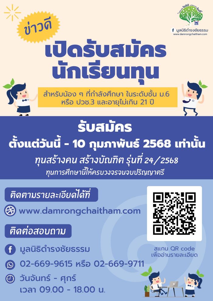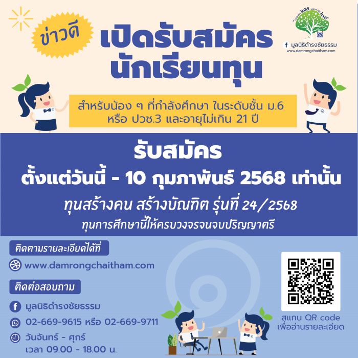 สำหรับผู้ที่สนใจสอบถามรายละเอียดและสมัครเข้ารับการคัดเลือกได้ที่ Website: www.damrongchaitham.com, Facebook: มูลนิธิดำรงชัยธรรม หรือ โทร 02-669-9711, 02-669-9615
