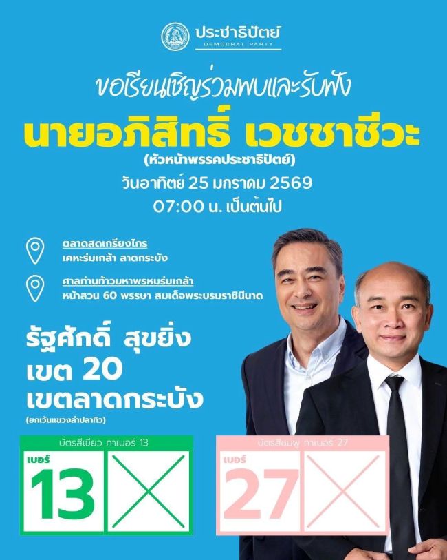 วันที่ 25 มกราคม 2569 พรรคประชาธิปัตย์ นำโดย นายอภิสิทธิ์ เวชชาชีวะ หัวหน้าพรรค ประชาธิปัตย์ พร้อมด้วย นายสกลธี ภัททิยกุล รองหัวหน้าพรรค ลงพื้นที่เขตลาดกระบัง กรุงเทพมหานคร เพื่อร่วมช่วยหาเสียงและพบปะประชาชน สนับสนุนการทำงานของ นายรัฐศักดิ์ สุขยิ่ง ผู้สมัครสมาชิกสภาผู้แทนราษฎรกรุงเทพมหานคร เขต 20 เขตลาดกระบัง (ยกเว้นแขวงลำปลาทิว) พรรคประชาธิปัตย์