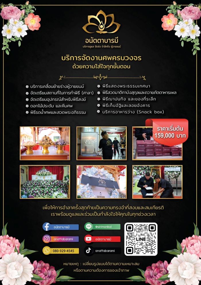 แม้ว่าการจากลาของผู้คนจะเกิดขึ้นเป็นเรื่องธรรมดา แต่การดำรงอยู่ของผู้คนก็ยังคงต้องมีต่อไปเช่นเดียวกัน ด้วยเหตุนี้เอง งานศพที่ดำเนินงานในนาม Sirimonkolgroup จึงเป็นงานที่จัดเตรียมด้วยความรู้สึกที่คิดอยู่เสมอว่า การตายไม่ใช่การจากลา หากเพียงแต่ต้องเป็นงานที่ทำให้รำลึกถึงคุณงามความดีของผู้วายชนน์ และงานที่จัดโดยอนันตาบารมี เป็นงานที่จัดโดยถูกหลักประเพณี เรียบง่าย และไม่ส่งผลเสียต่อระบบนิเวศ