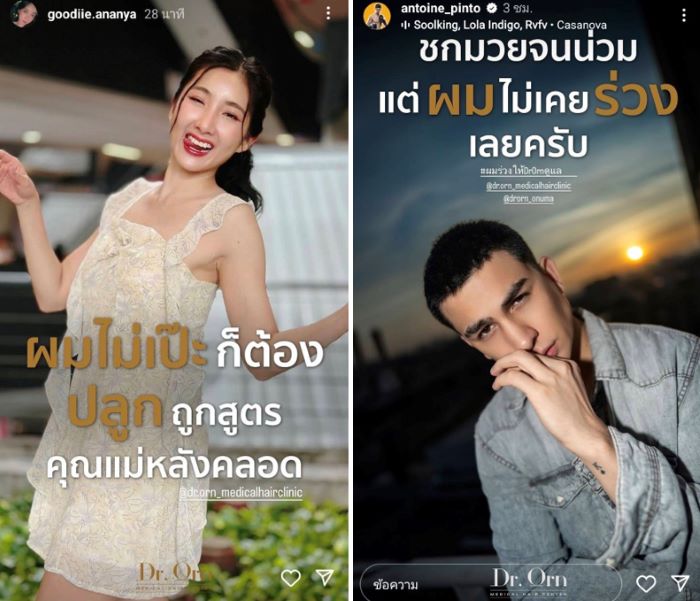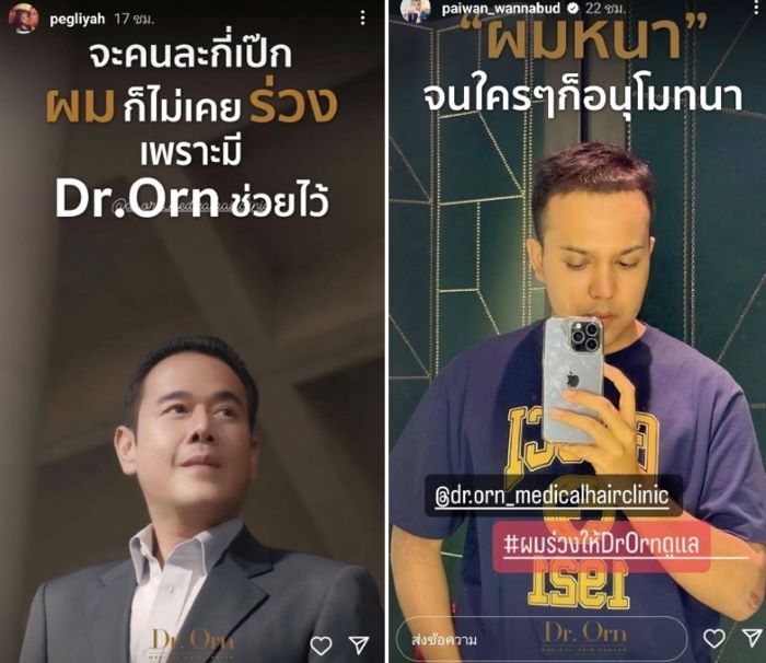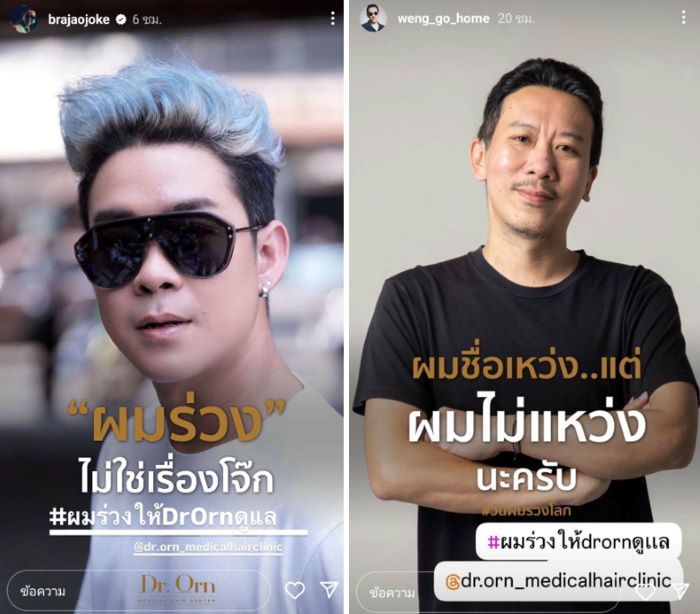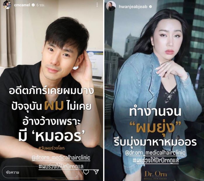 เป็นสีสันความบันเทิงที่เอามาฝากจากแคมเปญสุดเก๋ของคลินิกดูแลเส้นผมชื่อดัง Dr. Orn ของคุณหมอคนดัง ดร. อรอุมา พันธ์อภิวัฒน์ คุณหมอเฉพาะทางด้านเส้นผม มาตรฐานการปลูกผมระดับอเมริกันบอร์ด ที่ดาราและผู้มีชื่อเสียงหลากหลายวงการมั่นใจเลือกมาใช้บริการ ที่ชักชวนคนบันเทิงและเซเลป ฯ คนดัง มาสร้างสีสันรับเทรนด์ ‘วันผมร่วงโลก’ และเพื่อร่วมรณรงค์ให้ทุกคนที่สามารถประสบปัญหาผมร่วง ซึ่งเป็นปัญหาที่สำคัญที่สามารถป้องกันได้ ทาง Dr.Orn จึงจัดแคมเปญตรวจสุขภาพเส้นผมให้ฟรีถึงวันที่ 15 สิงหาคม 2567