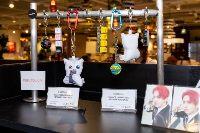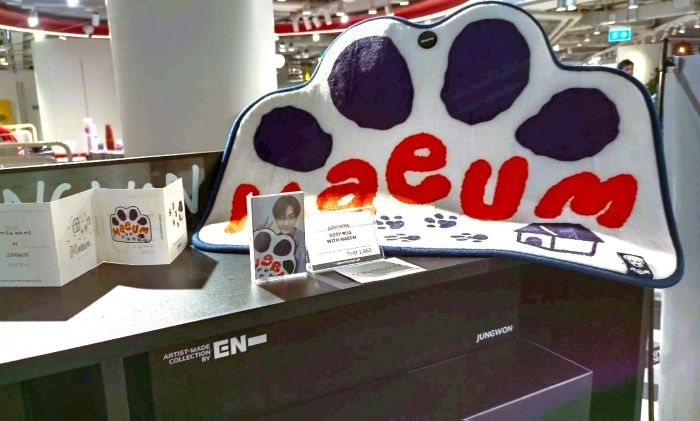 พรม COZY RUG WITH MAEUM โดย JUNGWON, พวงกุญแจและห่วง EVAN’S UNSERIOUS KEYRING PACKAGE, EVAN’S CACTUS AND CAT BADGE COLLECTION โดย HEESEUNG, JAY’S FAMILY T-SHIRT