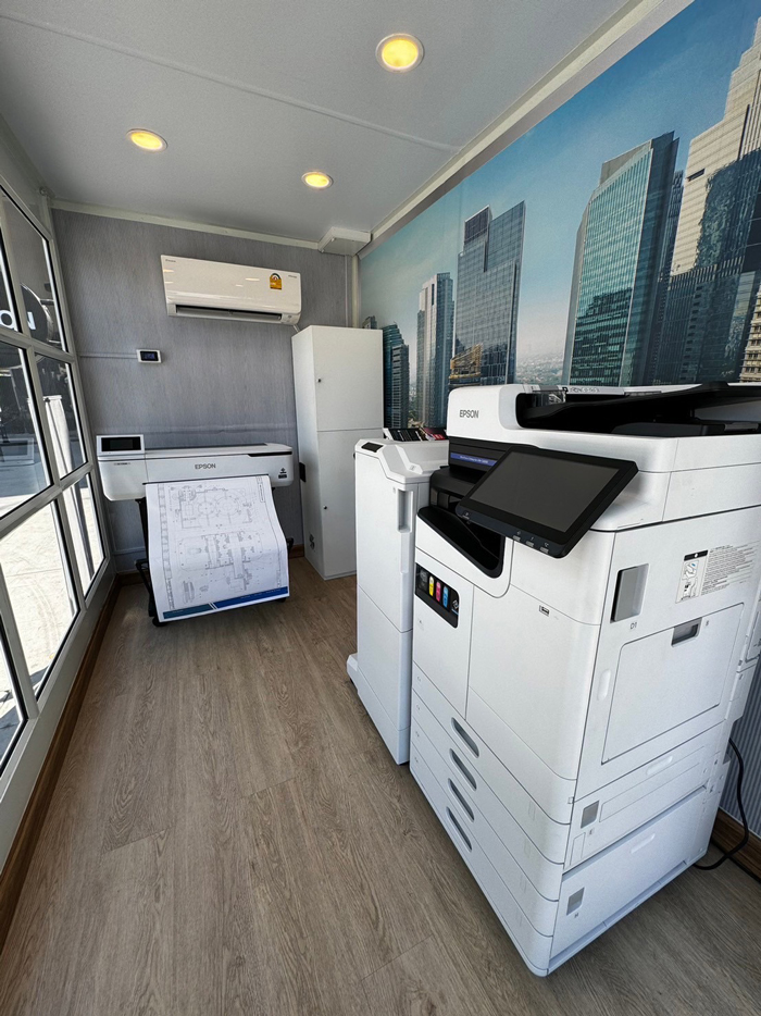 เครื่องพิมพ์อิงค์เจ็ทที่ติดตั้งอยู่ภายใน Epson Demo Car มีด้วยกัน 2 รุ่น ได้แก่ เครื่องมัลติฟังก์ชันแบบ 4 สี WorkForce Enterprise AM-Series รุ่น AM-C5000 มีประสิทธิภาพการทำงานที่ยอดเยี่ยม พิมพ์ด้วยความเร็วสูงต่อเนื่อง ให้งานพิมพ์คมชัดที่ความเร็ว 50 หน้าต่อนาที ใช้เทคโนโลยีการพิมพ์แบบ Heat-Free ซึ่งไม่ใช้ความร้อน ช่วยประหยัดพลังงานได้มากถึง 85% ลดการปล่อยก๊าซคาร์บอนฯ ใช้วัสดุสิ้นเปลืองน้อยกว่าเมื่อเทียบกับเครื่อง พิมพ์เลเซอร์ นอกจากนี้ยังถูกออกแบบระบบภายในให้สามารถใช้งานและบำรุงรักษาง่าย เพราะมีชิ้นส่วนอะไหล่ที่ต้องดูแลรักษาน้อย ส่วนอีกผลิตภัณฑ์ คือ Epson SureColor SC-T3130N เครื่องพิมพ์สำหรับมืออาชีพที่ให้ความเร็วในการพิมพ์สูง พิมพ์งานคุณภาพเยี่ยมและแม่นยำในทุกรายละเอียด ด้วยเทคโนโลยีหัวพิมพ์ที่ล้ำสมัย PrecisionCore Micro TFP มาพร้อมกับหมึกพิกเมนท์ UltraChrome XD2 เป็นหมึกกันน้ำที่ให้สีสวย ชัดเจน สม่ำเสมอในทุกโทนสีและยังติดทนนาน ใช้งานสะดวกเพราะเชื่อมต่อแบบไร้สายได้ รองรับงานออกแบบกราฟฟิก งานโปสเตอร์เพื่อใช้ภายในสำนักงาน และงานร่างประเภท CAD