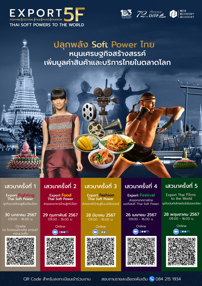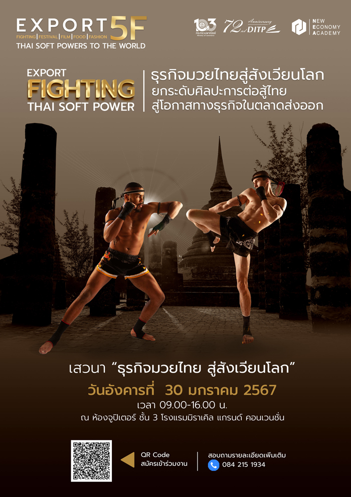 สถาบันพัฒนาผู้ประกอบการการค้ายุคใหม่ (NEA) กรมส่งเสริมการค้าระหว่างประเทศ กระทรวงพาณิชย์ เชิญชวนผู้ประกอบการไทยและผู้ที่สนใจดำเนินธุรกิจด้านการค้าระหว่างประเทศ เข้าร่วมโครงการเสวนา “Export 5F: Thai Soft Powers to the World” (Fighting, Food, Fashion, Festival and Films) พร้อมเปิดเวทีเสวนา ครั้งที่ 1 “Export Fighting – Thai Soft Power: ธุรกิจมวยไทย สู่สังเวียนโลก” โดยได้รับเกียรติจาก รองอธิบดีกรมส่งเสริมการค้าระหว่างประเทศ (นางอารดา เฟื่องทอง) ร่วมบรรยายพิเศษ “ยุทธศาสตร์ Thai Soft Power เพื่อเศรษฐกิจไทย” และเป็นประธานเปิดงาน พร้อมการแสดงสุดพิเศษ! “มวยไทยสู่สังเวียนโลก” โดย เพชรจีจ้า “The Queen” ลูกเจ้าพ่อโรงต้ม แชมป์โลก ONE คิกบ็อกซิ่ง รุ่นอะตอมเวตหญิง เฉพาะกาล ในวันพุธที่ 30 มกราคม 2567 เวลา 09.00-16.00 น. ณ ห้องจูปิเตอร์ ชั้น 3 โรงแรมมิราเคิล แกรนด์ คอนเวนชั่น