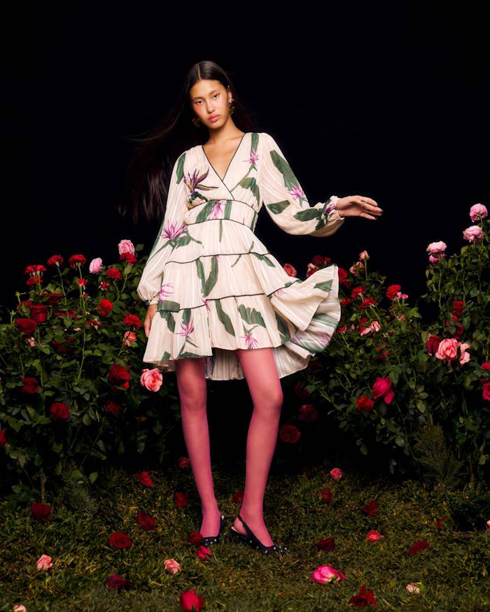 คัตติ้งสุดประณีตที่สะท้อนรสนิยมของผู้หญิง พร้อมเข้ามาเติมชีวิตชีวาให้กับการแต่งตัวอย่างมีระดับ หยิบเอาแรงบันดาลใจจากความงดงามของธรรมชาติที่แอบซ่อนความเย้ายวนน่าค้นหาเอาไว้ในทุกรายละเอียด โดยมีไฮไลต์เป็นลายพิมพ์ใบไม้สีเขียวสดแกมดอกไม้สีม่วงปักเลื่อมระยิบระยับ ปรากฏอยู่บนเนื้อผ้าสีขาวเรียบหรูของชุดเซตและเดรสแบบต่างๆ ช่วยการันตีการครีเอทลุคที่บาลานซ์ระหว่างความสง่างามและความโดดเด่นได้อย่างลงตัว