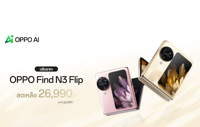 OPPO ให้คุณพับได้ง่ายกว่าเดิมด้วย OPPO Find N3 Flip สมาร์ตโฟนพับกับกล้องที่ดีกว่ามาพร้อม AI พร้อมใช้งานแล้ววันนี้ กับราคาใหม่เพียง 26,990 บาท จากราคาปกติ 29,990 บาท ตั้งแต่วันที่ 6 มิถุนายน 2567 เป็นต้นไป