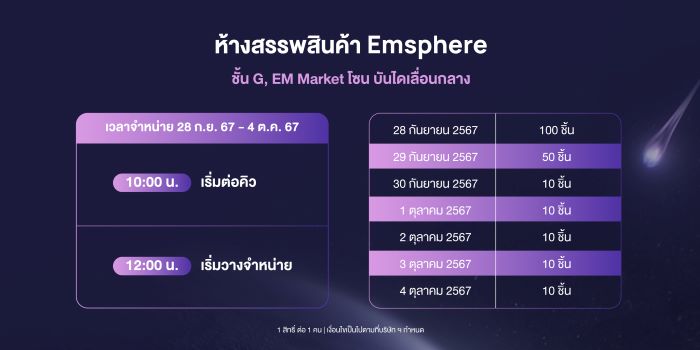 แฟนๆ ที่สนใจคอลเล็กชันนี้ HUAWEI FreeBuds 6i x SKULLPANDA จะวางจำหน่ายในงาน Roadshow ที่ห้างสรรพสินค้า EMSPHERE จำนวนทั้งหมด 200 ชิ้น โดยลูกค้าสามารถสั่งซื้อตามคิว โดยจะเปิดให้ต่อแถวรอรับบัตรคิวเวลา 10.00 น. เป็นต้นไป และจะแจกบัตรคิวและวางจำหน่ายพร้อมกันในเวลา 11.00 น. ตามจำนวนรายละเอียดดังต่อไปนี้