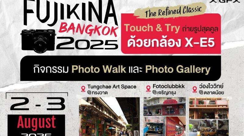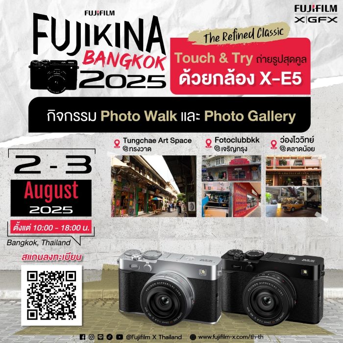 บริษัท ฟูจิฟิล์ม (ประเทศไทย) จำกัด เตรียมกลับมาเปิดประสบการณ์สุดพิเศษให้คนรักการถ่ายภาพและแฟน ๆ ฟูจิฟิล์ม อีกครั้ง กับอีเวนต์ใหญ่ในการ Touch & Try กล้องของฟูจิฟิล์มที่หลายคนรอคอยอย่าง “FUJIKINA Bangkok 2025” ภายใต้คอนเซปต์ “The Refined Classic” ซึ่งจะจัดขึ้นในวันที่ 2-3 สิงหาคม 2568 ชวนทุกคนมาเปิดมุมมองใหม่ ๆ กับการเก็บโมเมนต์ในสไตล์ของตนเองด้วย X-E5 กล้องดิจิทัลมิเรอร์เลสรุ่นใหม่ล่าสุดที่มาพร้อมดีไซน์คลาสสิกและเทคโนโลยีล้ำสมัย ผ่านการเดินชม 3 ย่านสุดฮิตของกรุงเทพฯ ที่แต่ละแห่งเต็มไปด้วยเรื่องราวและเสน่ห์เฉพาะตัว