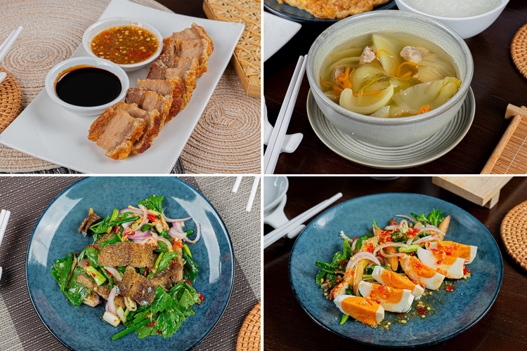 ผัดแขนงหมูกรอบ, ผัดกุยช่ายขาวเต้าหู้, หมูสามชั้นทอดน้ำปลา, หมูนึ่งไข่เค็ม