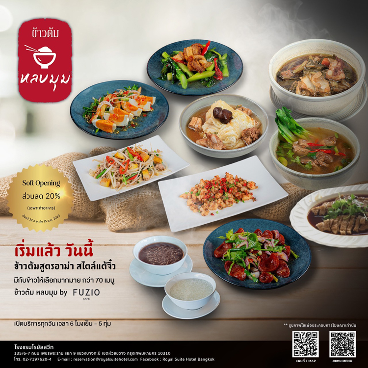 ข้าวต้ม อาหารการกินอยู่แบบจีน ที่เข้ามาอยู่ในวิถีชีวิตคนไทยได้อย่างกลมกลืน นึกอยากจะกินข้าวต้มเวลาไหน ก็เลือกสรรได้ แตกต่างกันไปตามรสนิยม หากชื่นชอบข้าวต้มแต้จิ๋วแท้ๆ ข้าวต้ม…หลบมุม by FUZiO Café สูตรอาม่า สไตล์แต้จิ๋ว นับเป็นอีกหนึ่งตำรับที่รับรองถูกปากบรรดาคอข้าวต้มอย่างแน่นอน ที่แน่ๆ ไม่ต้องหลบมุมไปตามตรอกซอกซอยที่ไหน แต่เปิดบริการรอให้ลิ้มลองพร้อมสารพัดกับข้าวกันแล้ว ที่ FUZiO Café โรงแรมรอยัล สวีท ย่านพระราม 9