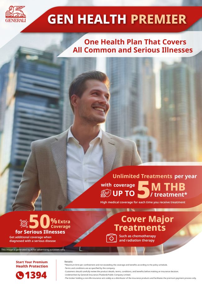 เจนเนอราลี่ ประกันภัย (ไทยแลนด์) เดินเกมรุกตลาดประกันสุขภาพระดับพรีเมียมเต็มรูปแบบ เปิดตัวผลิตภัณฑ์ใหม่ “GEN HEALTH PREMIER” เจน เฮลท์ พรีเมียร์ ภายใต้แนวคิด Beyond Lump Sum ที่ออกแบบให้ก้าวข้ามข้อจำกัดของแผนเหมาจ่ายให้พรีเมียมกว่าเดิม พร้อมตอบโจทย์ไลฟ์สไตล์ผู้บริโภคที่ให้ความสำคัญกับความคุ้มครองที่ครอบคลุมและคุ้มค่าในระยะยาว ทั้งกลุ่มลูกค้าที่ให้ความสำคัญประกันสุขภาพที่คุ้มตอบโจทย์การบริการแบบพรีเมียม และชาวต่างชาติที่ทำงานหรือพำนักในประเทศไทยที่ต้องการความคุ้มครองแบบครบ จบในกรมธรรม์เดียว เอ็กซ์คลูซีฟผ่านช่องทางนายหน้าประกันภัย เจนเนอราลี่ เท่านั้น