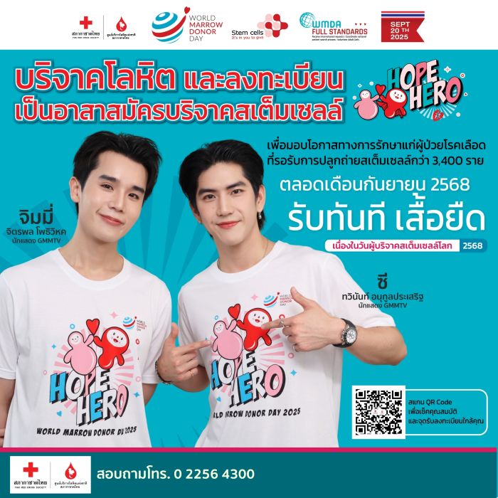 จิมมี่-จิตรพล โพธิวิหค และ ซี-ทวินันท์ อนุกูลประเสริฐ นักแสดง GMMTV เสริมทัพ ดีเจอ้อย-นภาพร ไตรวิทย์วารีกุล ดีเจ GREEN WAVE – ATIME และ ดีเจแนน-รชาดา จึงวัฒนกิจ ดีเจ EFM – ATIME ชวนทุกคนมาร่วมเป็นฮีโร่มอบโอกาสในการรักษาให้กับผู้ป่วยโรคเลือด เนื่องในวันผู้บริจาคสเต็มเซลล์โลก ประจำปี 2568 โดย ศูนย์บริการโลหิตแห่งชาติ สภากาชาดไทย ได้จัดกิจกรรมภายใต้แนวคิด “Hope Hero” เพราะทุกคน…คือฮีโร่ เพื่อเป็นการขอบคุณผู้บริจาคสเต็มเซลล์และผู้ลงทะเบียนเป็นอาสาสมัครบริจาคสเต็มเซลล์