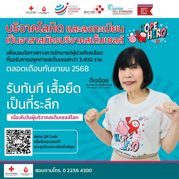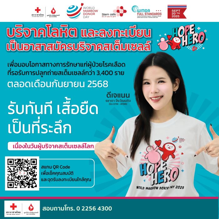 พร้อมเชิญชวนประชาชนร่วมบริจาคโลหิตและลงทะเบียนเป็นอาสาสมัครบริจาคสเต็มเซลล์ตลอดเดือนกันยายนนี้ ณ ศูนย์บริการโลหิตแห่งชาติ สถานีกาชาด 11 วิเศษนิยม (บางแค) และภาคบริการโลหิตแห่งชาติ 8 แห่ง ได้แก่ จังหวัดชลบุรี ราชบุรี นครราชสีมา ขอนแก่น นครสวรรค์ พิษณุโลก เชียงใหม่ และสงขลา พร้อมรับเสื้อยืด “Hope Hero” เป็นที่ระลึก สอบถามข้อมูลเพิ่มเติมได้ที่ โทร 0-2256-4300