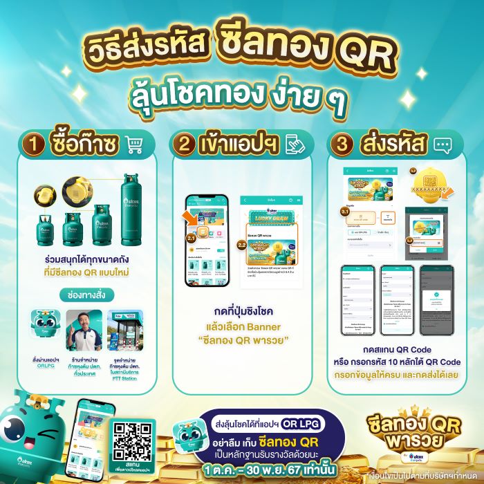 พิเศษ! แคมเปญ “ซีลทอง QR พารวย กับ ก๊าซหุงต้ม ปตท.” แจกโชคใหญ่ส่งท้ายปี ลุ้นโชคทองและของรางวัลอีกเพียบได้ง่าย ๆ เพียงสแกน QR Code หรือส่งรหัส 10 หลักที่อยู่ใต้ QR Code ผ่านแอปพลิเคชัน OR LPG (https://pttor.page.link/orlpg) ลุ้นรับรางวัลใหญ่ อาทิ ทองคำแท่งหนัก 20 บาท ทองคำแห่งหนัก 10 บาท ทองคำแท่งหนัก 5 บาท ทองคำแท่งหนัก 1 บาท คะแนน blueplus+ 100,000 คะแนน และของรางวัลอื่น ๆ จำนวนทั้งสิ้น 218 รางวัล รวมมูลค่าของรางวัลกว่า 6.4 ล้านบาท และสำหรับร้านค้าจำหน่ายก๊าซหุงต้ม ปตท. ที่ให้บริการลูกค้าผู้โชคดี ยังมีสิทธิ์รับเซตของรางวัลพิเศษเพิ่มเติมอีก 40 รางวัล เริ่มส่งรหัสชิงโชคได้ตั้งแต่วันที่ 1 ตุลาคม 2567 – 30 พฤศจิกายน 2567 พร้อมสั่งก๊าซหุงต้ม ปตท. ซีลทอง QR แบบใหม่ได้แล้ววันนี้ผ่านแอป OR LPG, ร้านจำหน่ายก๊าซหุงต้ม ปตท. ทั่วประเทศ, จุดจำหน่าย ก๊าซหุงต้ม ปตท. ในสถานีบริการ พีทีที สเตชั่น หรือค้นหาร้านค้าตัวแทนใกล้บ้านได้ที่ www.pttlpgshops.com