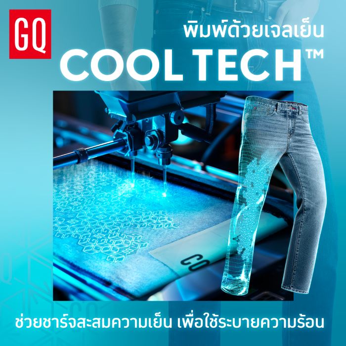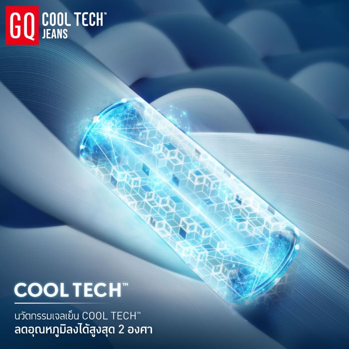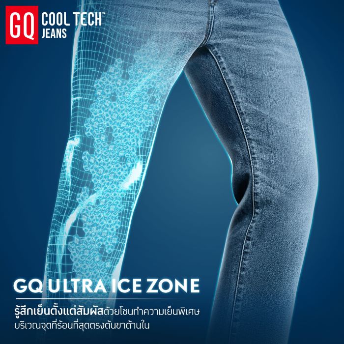 ด้วยความมุ่งมั่นที่จะพัฒนาสินค้าที่เหมาะสมกับสภาพอากาศร้อน และตอบโจทย์ความต้องการของผู้บริโภค GQ ได้ออกแบบ GQ Cool Tech™ Jeans ยีนส์แรกของโลกที่พร้อมมอบความเย็นทันทีที่สัมผัส ผ่านการทำงานร่วมกันของ GQ Ultra Ice Zone โซนความเย็นพิเศษที่พิมพ์หมึกเจลเย็น Cool Tech™ ลงไปบนเนื้อผ้า บริเวณต้นขาด้านในซึ่งเป็นจุดหลักที่ร่างกายระบายความร้อนตลอดทั้งวัน ช่วยชาร์จสะสมความเย็น
