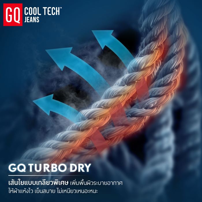 และระบายความร้อน ลดอุณหภูมิลงได้สูงสุดถึง 2 องศา และ GQ Turbo Dry ด้วยเส้นใยแบบเกลียวพิเศษ เพิ่มพื้นผิวระบายอากาศให้ผ้าแห้งไวไม่อึดอัด โล่งสบาย ไม่เหนียวเหนอะหนะ ระบายเหงื่อได้ดี ช่วยให้รู้สึกสบายเวลาที่สวมใส่ แม้ในวันที่อากาศร้อน ด้วยสองเทคโนโลยีนี้ จึงทำให้ GQ Cool Tech™ Jeans ไม่ใช่แค่ยีนส์ที่แห้งเย็นด้วยการระบายอากาศอย่างเดียวแบบกางเกงยีนส์ทั่วไป แต่สามารถสร้างความเย็นที่คุณสัมผัสได้เองตั้งแต่แรกใส่